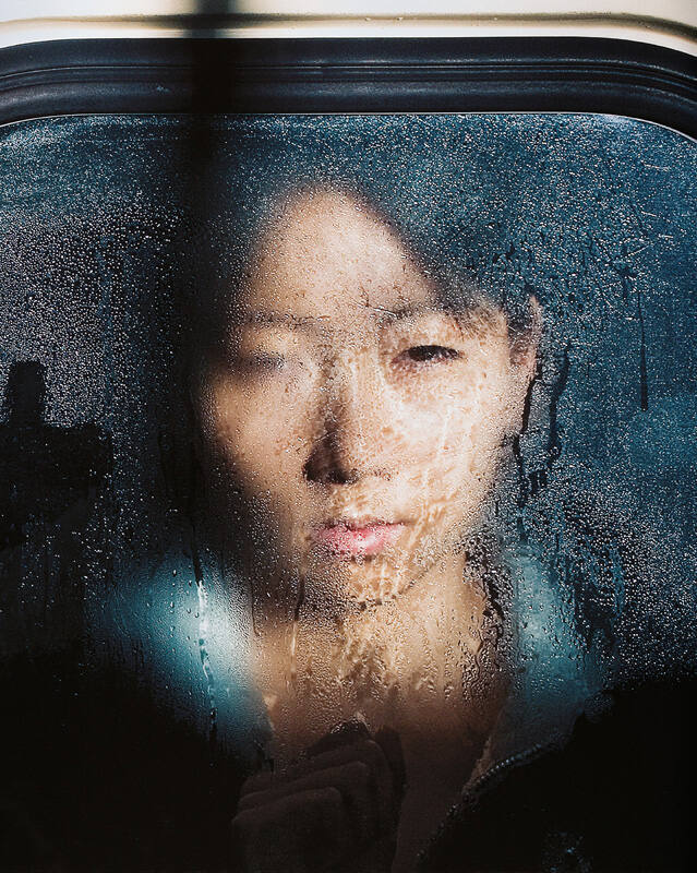 DescriptionPortrait of a woman as seen through a window covered in condensation; the collar of her zippered jacket is light blue.Gallery Label