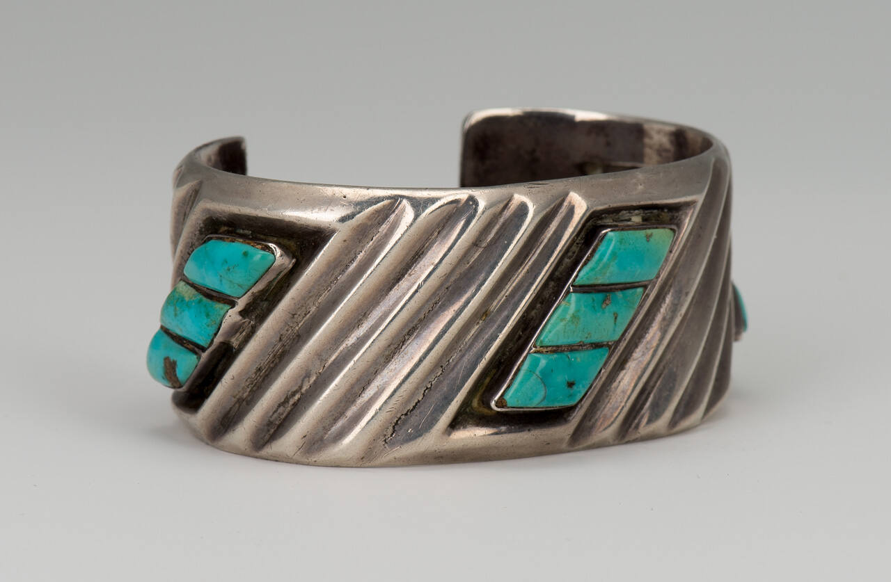 DescriptionSilver and turquoise bracelet with nine rectangular shaped stones, set in a series of three in the middle and at both ends. The silver is fluted on the diagonalCopyrightThis work is copyrighted. Contact the copyright holder for permission to reproduce.