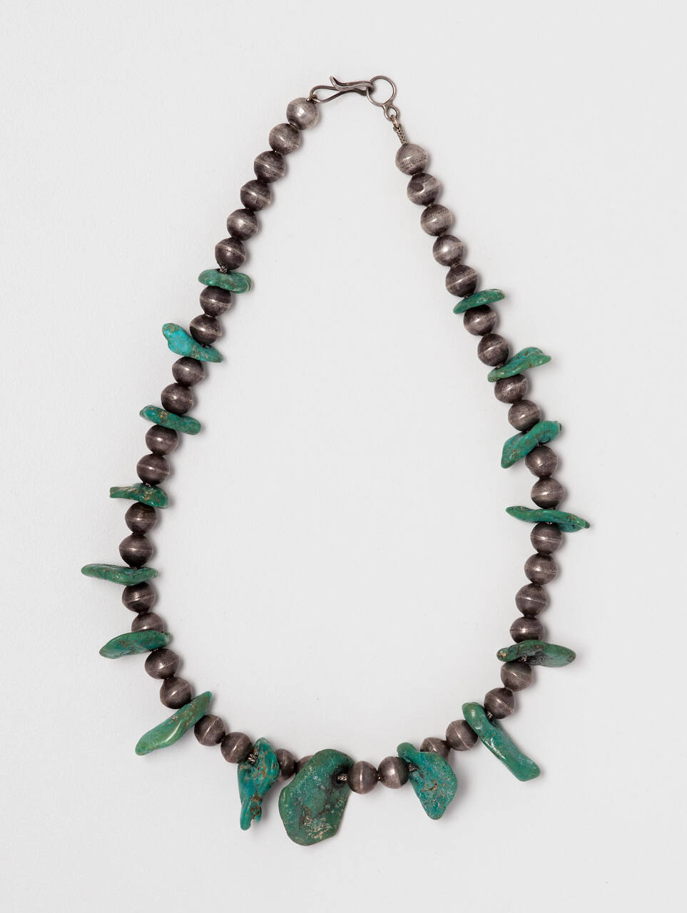 DescriptionSilver and turquoise necklace strung on a silver chain with sixteen pieces of polished turquoise separated by two hollow silver balls between each pieceCopyrightThis work is copyrighted. Contact the copyright holder for permission to reproduce.