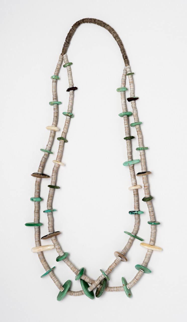 DescriptionNecklace comprised of small thin shell discs interspersed with larger pieces of turquoise strung on a cotton cord.CopyrightThis work is copyrighted. Contact the copyright holder for permission to reproduce.