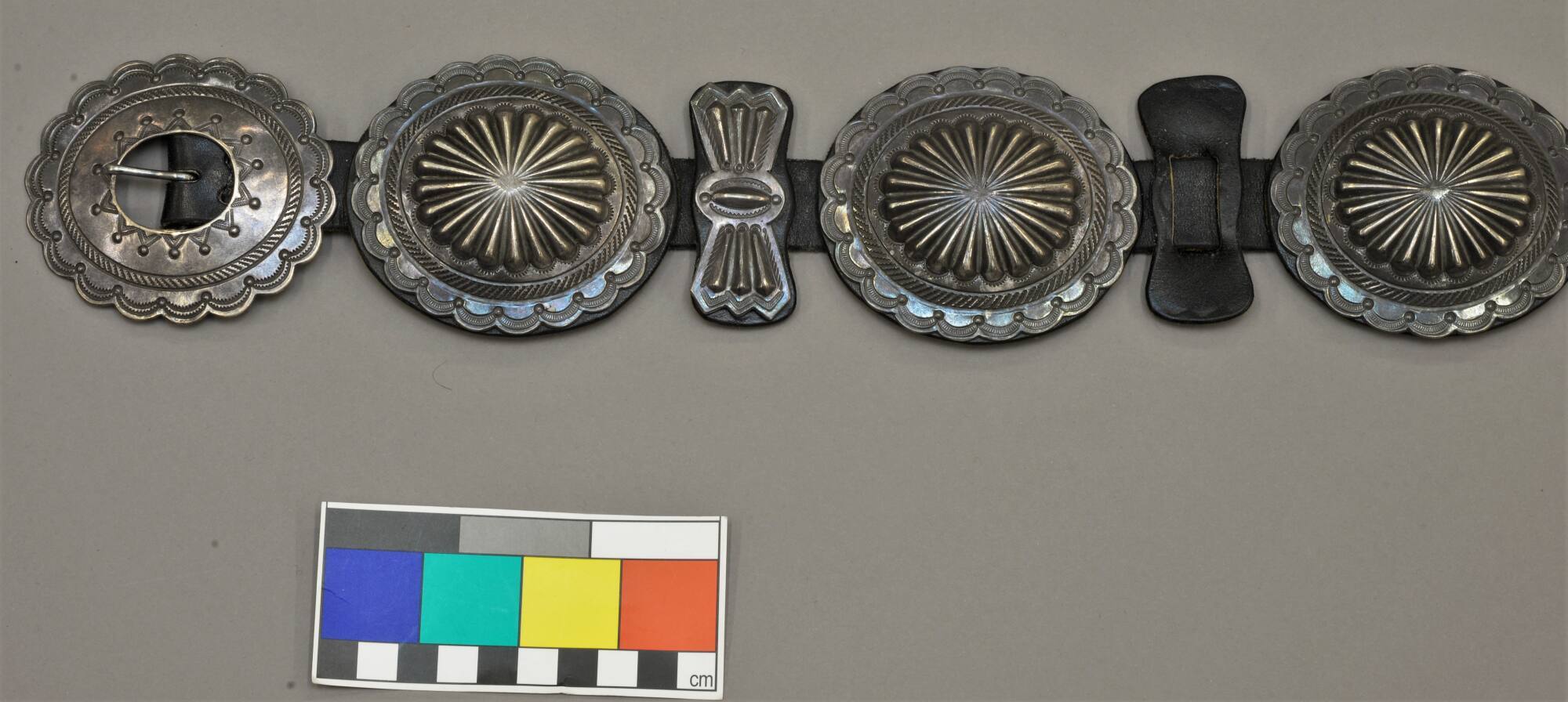 DescriptionLeather belt with six silver conchas, a silver buckle, and five silver bow-shaped elements engraved with scallops and rope designs