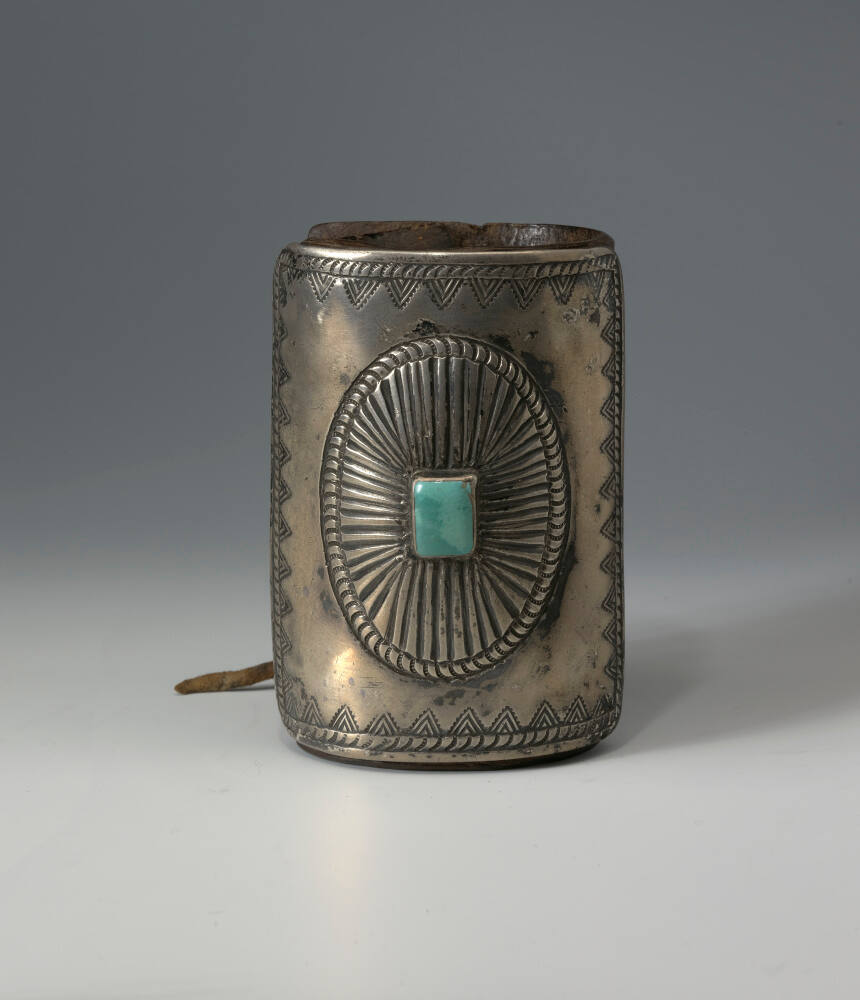DescriptionLeather ketoh with a rectangular-shaped turquoise stone set within a stamped circular design, a rope and saw tooth design engraved around the edges