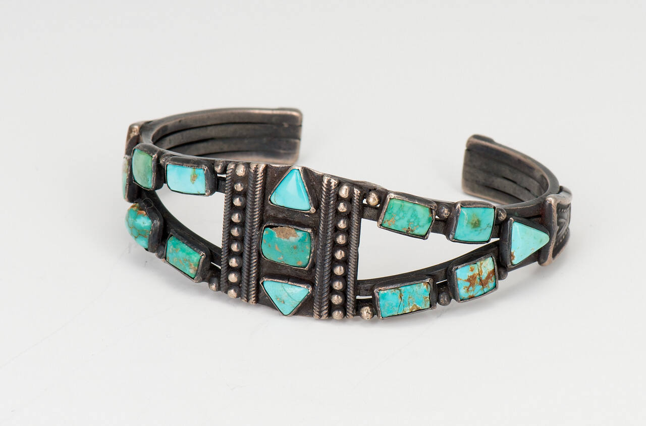 DescriptionSilver bracelet set with four triangular and nine rectangular-shaped pieces of turquoise