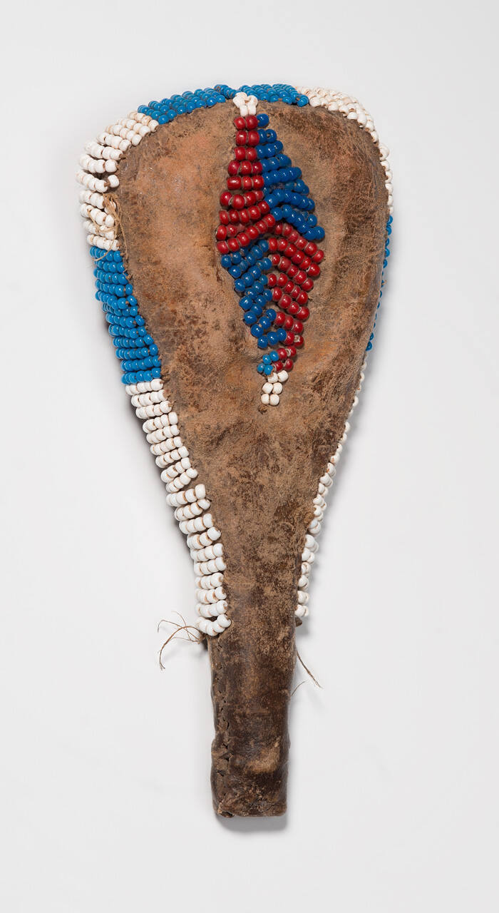 DescriptionRattle with red, white and blue glass beads sewn around the perimeter and two diamond-shaped beaded elements sewn on either side