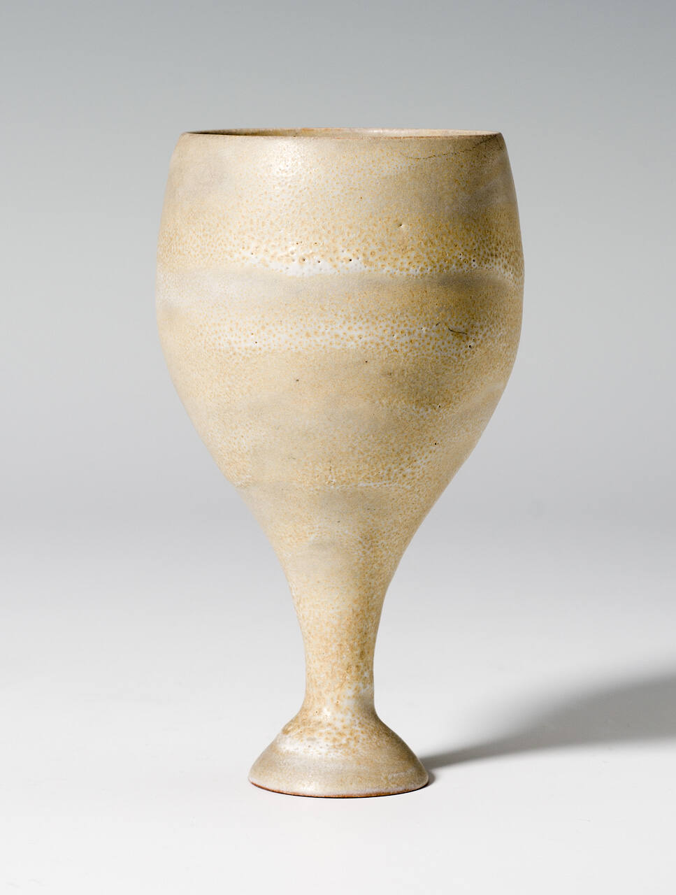DescriptionChalice has matte yellow/white glaze with some green/grey highlights. Cratered or bubbly glaze moving in slight horizontal ripple pattern.Copyright© Gail Reynolds Natzler, Trustee of the Natzler Trust