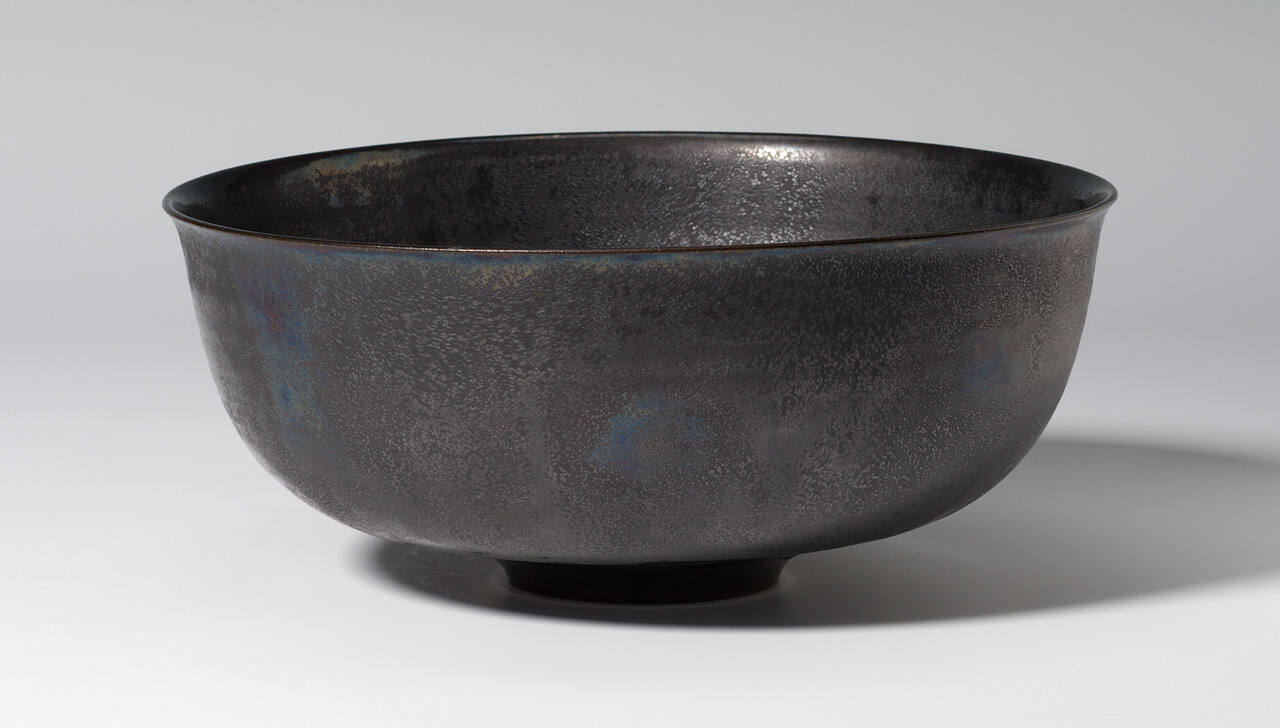 DescriptionBowl has smooth dark grey-black glaze, some shiny and some matte areas. Horizontal concentric circle manipulation of clay visible, becomes a swirl in the inside center.Copyright© Gail Reynolds Natzler, Trustee of the Natzler Trust