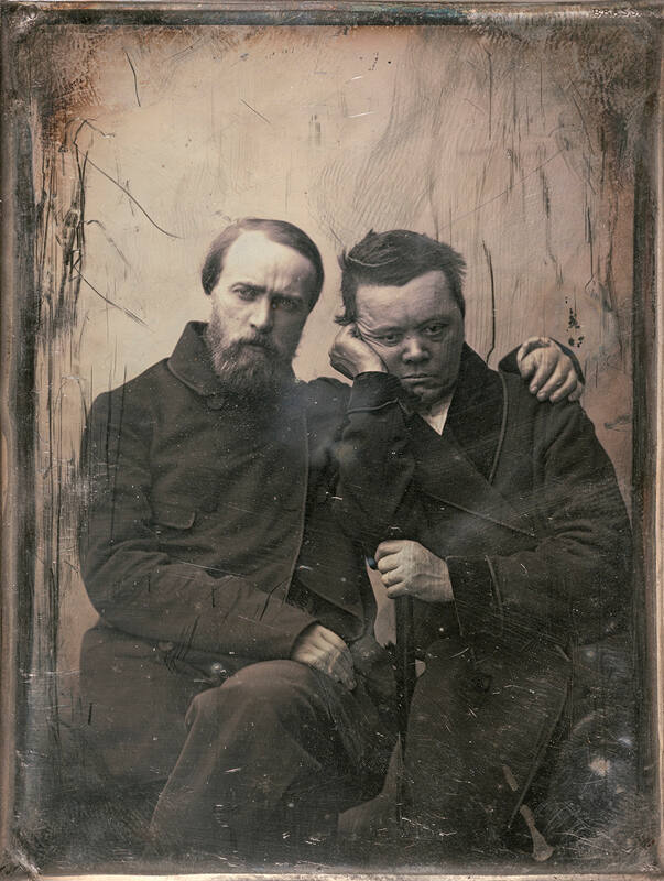 DescriptionImage of two seated men, one with his hand resting on the other's shoulder. This uncased daguerreotype is housed in 2 sheets of 4-ply white matboard and sealed with green paper tape.ProvenancePurchased from Vintage Works, Chalfort, PA by The Hall Family Foundation, Kansas City, MO, 2012;