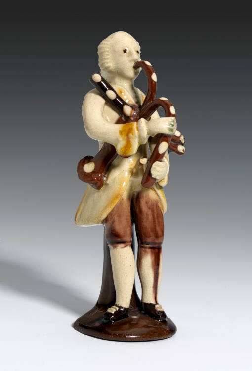 Gallery LabelHere is a musician who provides entertainment with a horn. Although rendered with simple charm, thoughtful consideration has been given to accurate representations of the man's 18th-century dress and the instrument. Although rendered with simple charm, thoughtful consideration has been given to accurate representations of the men's 18th-century dress and the individual instruments.