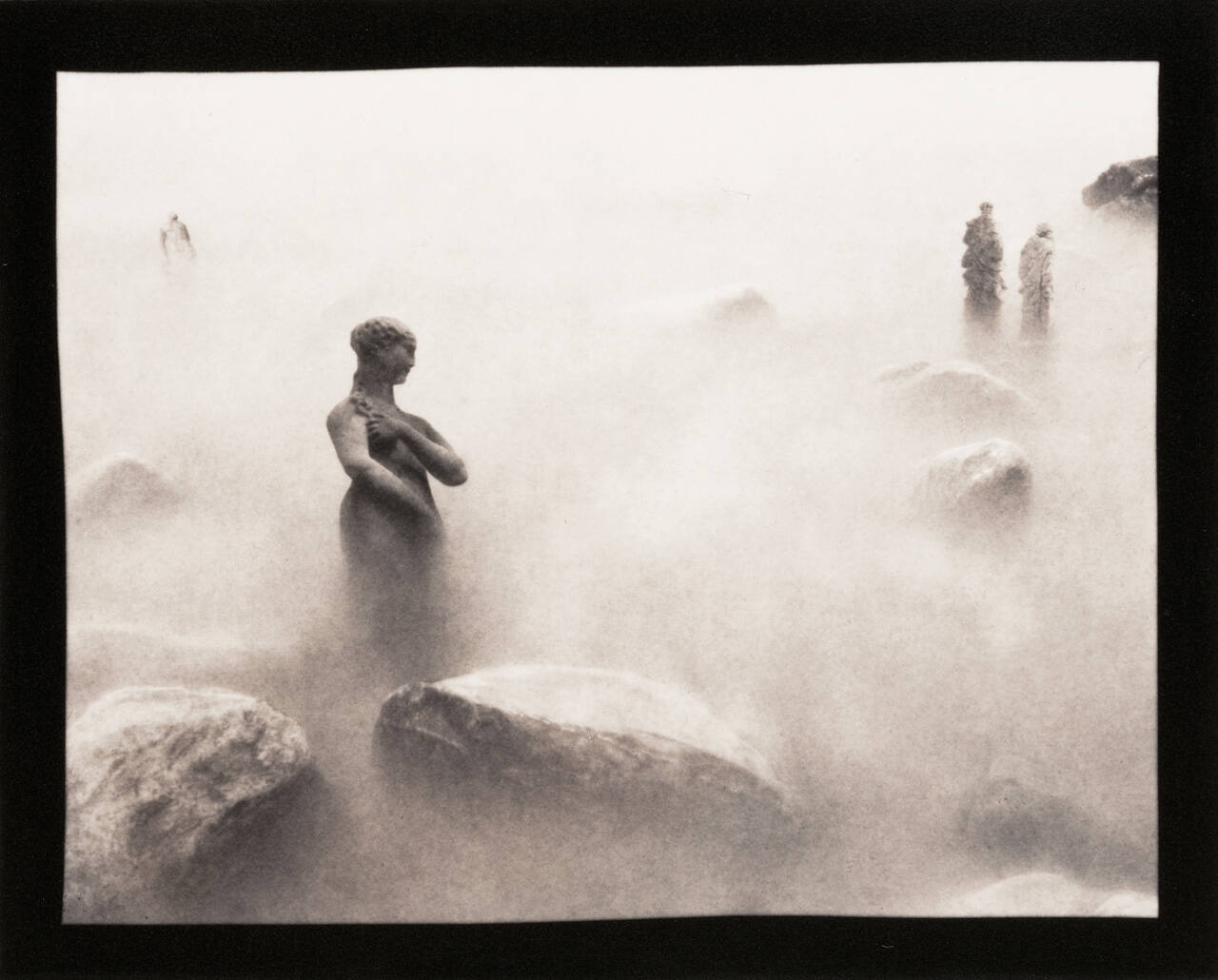 DescriptionImage of nude female sculpture surrounded by large rocks and partially hidden by fog.Copyright© Ruth Thorne-Thomsen