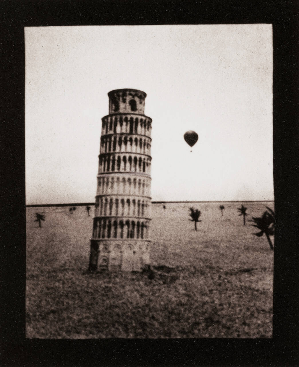 DescriptionImage of a leaning tower among a landscape littered with tiny palm trees and a hot air balloon in the sky.Copyright© Ruth Thorne-Thomsen