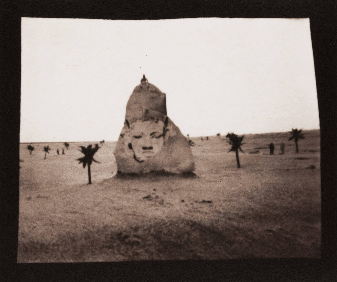DescriptionImage of a sphinx head with a figure seated on top and surrounded by sand and tiny palm trees.Gallery LabelRuth Thorne-Thomsen lifts the central compositional element of Maxime Du Camp’s iconic photograph Western Giant of the Speos of Phre and inserts it into her own fabricated scene. The unique optical qualities of her view derive from working with a pinhole camera. This simple apparatus renders subjects near and far with a similar degree of definition, thus confusing spatial depth and sense of scale. Though her scene is a complete fiction, it appears somewhat plausible, if mysterious, in its rendering.