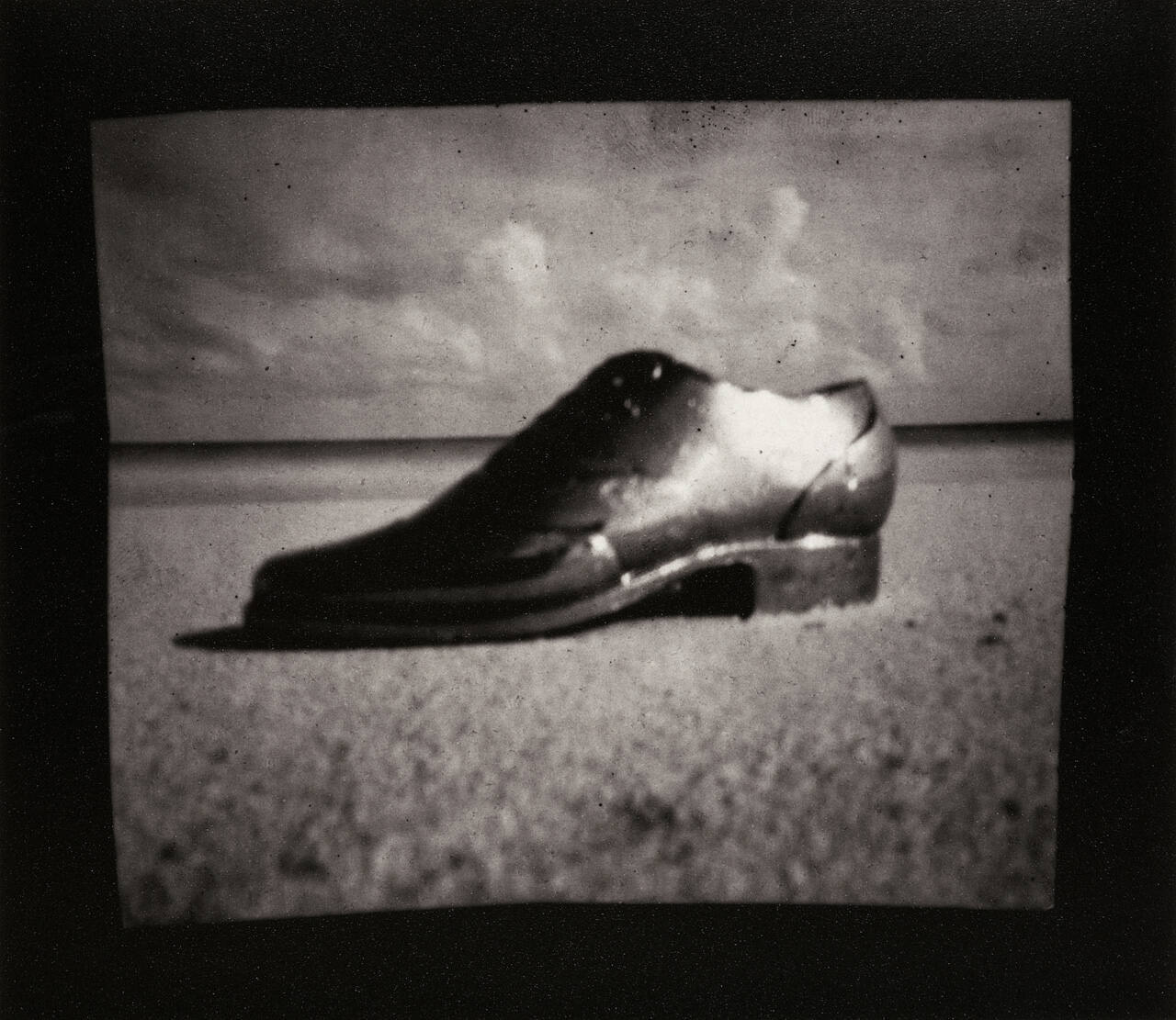 DescriptionImage of a man's dress shoe on a sandy beach with clouds above.Copyright© Ruth Thorne-Thomsen