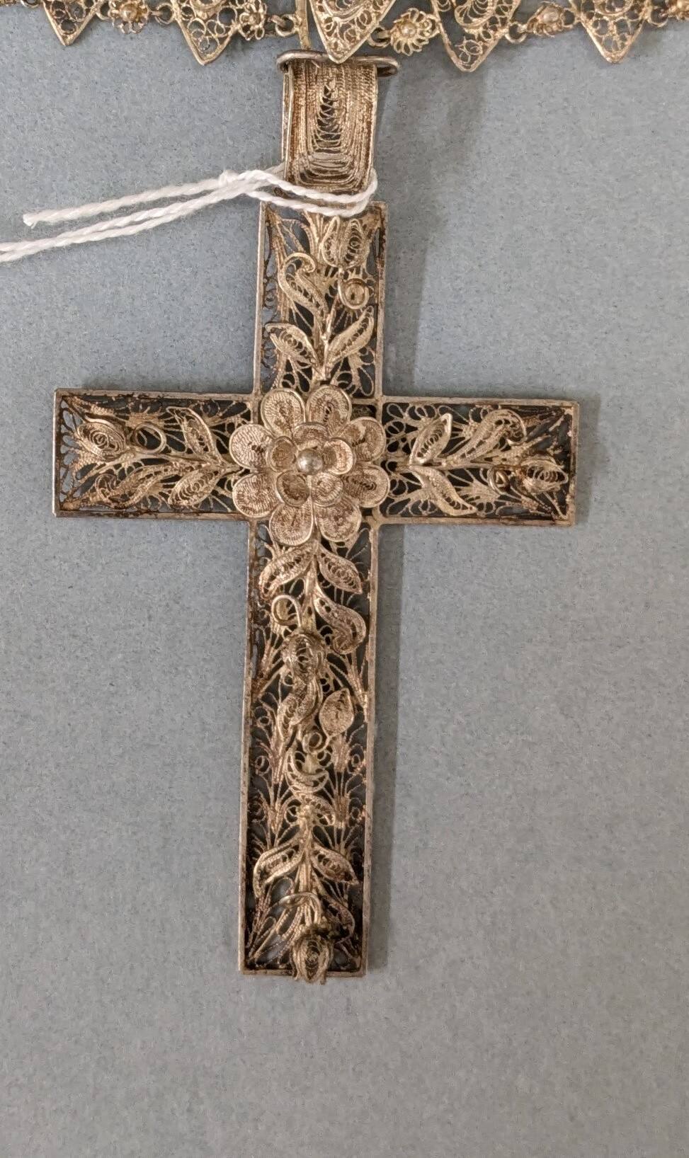 DescriptionSilver filigree cross with rosette in center, leaves and flowers extending to four parts of cross. Filigree loop at top.