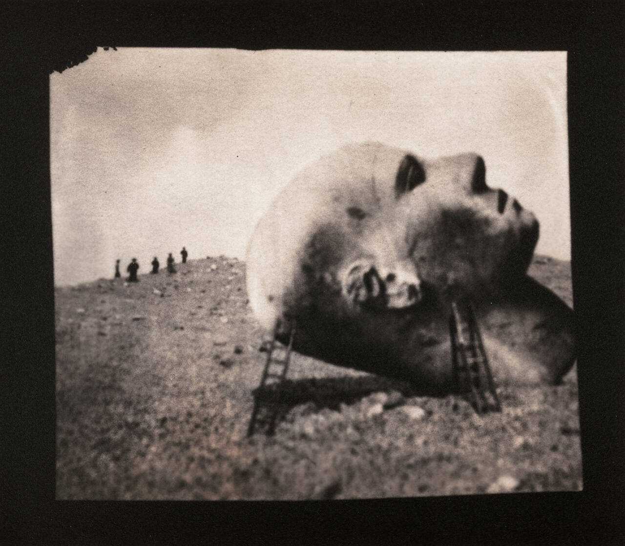 DescriptionImage of large head laying in the middle of an arid landscaped with ladders leaned against it and silhouetted figures approaching from the distance.Copyright© Ruth Thorne-Thomsen