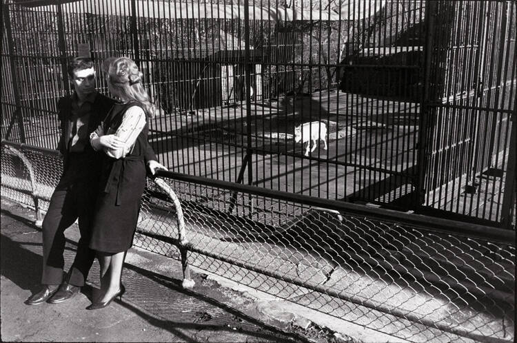 DescriptionImage of a couple standing outside of a gate with backs towards wolf inside large cage.Exhibition HistoryRotation 23. The Nelson-Atkins Museum of Art, Kansas City,