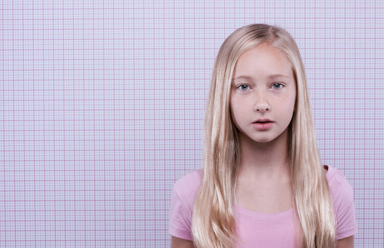 DescriptionPortrait of a teenaged girl with straight blonde hair and blue eyes wearing a pink scoop neck t-shirt and standing in front of a pink grid.