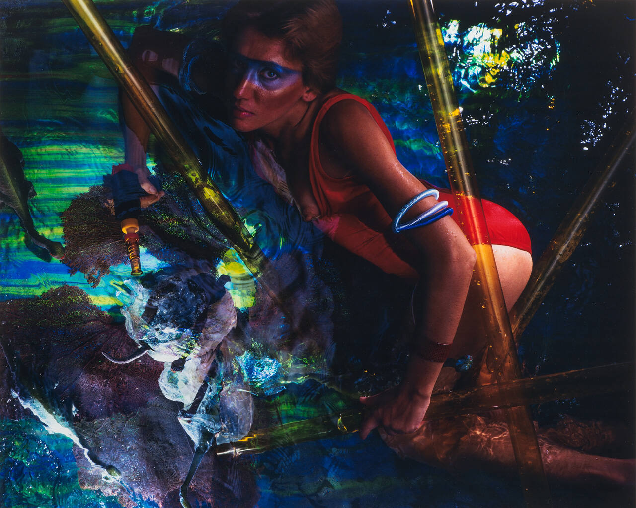 DescriptionImage of woman in red swimming suit partially immersed in iridescent water with transparent yellow tubes scattered throughout.