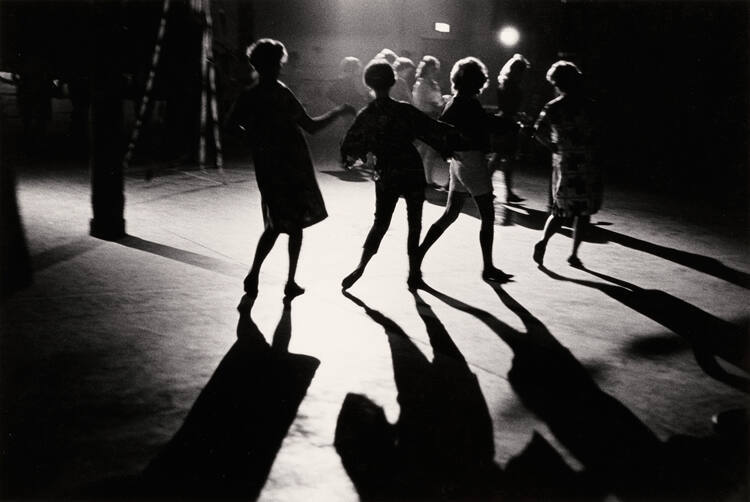 DescriptionImage of figures dancing in a winding line with a spot light in the background.