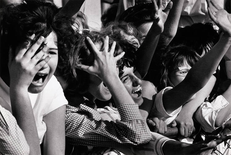 DescriptionImage of a group of teenage girls screaming frantically with arms raised standing behind a chain-link fence.Copyright© Estate of Joseph Sterling