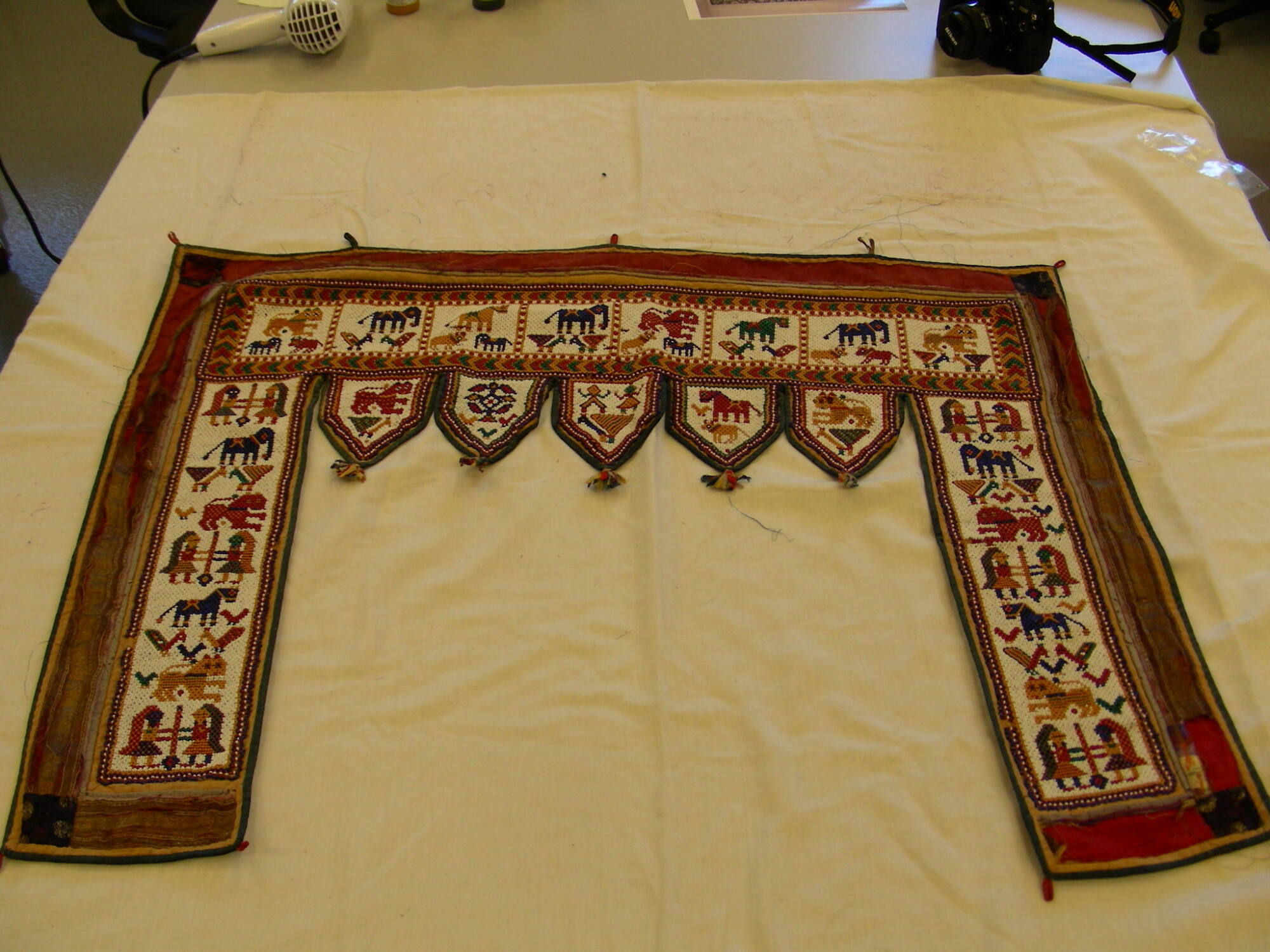 DescriptionThis door hanging, known as a toran, is comprised of beadwork with woven cotton cloth backing. Meant to frame the top of a doorway as a sign of welcome, the toran is comprised of an upper horizontal band with narrow vertical segments extending downward along each side. Five small hexagon shaped pendants hang from the center of the horizontal band and terminate with small tassels. The toran features a colorful exterior border pieced together from thin strips of multi-colored cotton fabric. Colorful glass beadwork decorates the interior sections of the toran. A simple backdrop of white beads highlights the colorfully beaded designs of abstracted patterns, vegetation, human figures, and various animals, including peacocks, elephants, horses, and lions.
