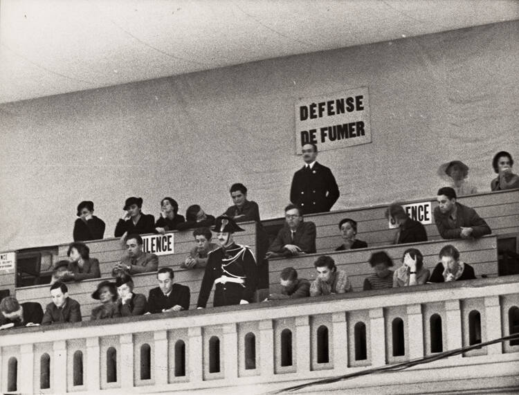 DescriptionImage of a group of individuals seated in an upper balcony with two dressed guards; sign reads “DEFENSE / DE FUMER” [no smoking].Exhibition History