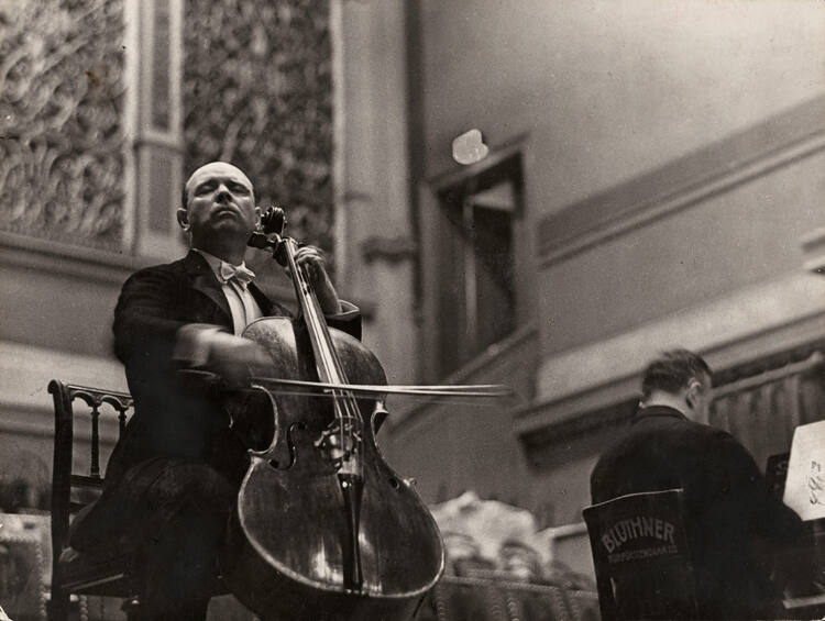 InscribedInscribed on back of sheet, in pencil “Oslo-Vienna / The world’s most famous cellist Pablo Casals / playing in the Philharmonic / in Berlin / (taken during the performance) / G [circled] / s/s / P34 / 72.9 / 103 9 / ES/TL76 PF33912TL” and on back of sheet, right edge in blue pencil “CASALS, PABLO”