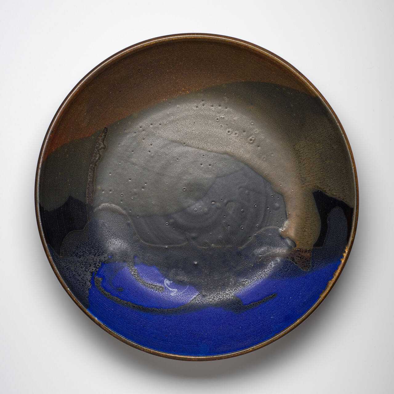 DescriptionLarge shallow bowl with the splashes of bright cobalt blue, dark grey and brown glaze in the interior. The exterior an iron red glaze. The bottom inscribed with double parallel lines connected by vertical parallel lines (TT).Copyright© Toshiko Takaezu Foundation