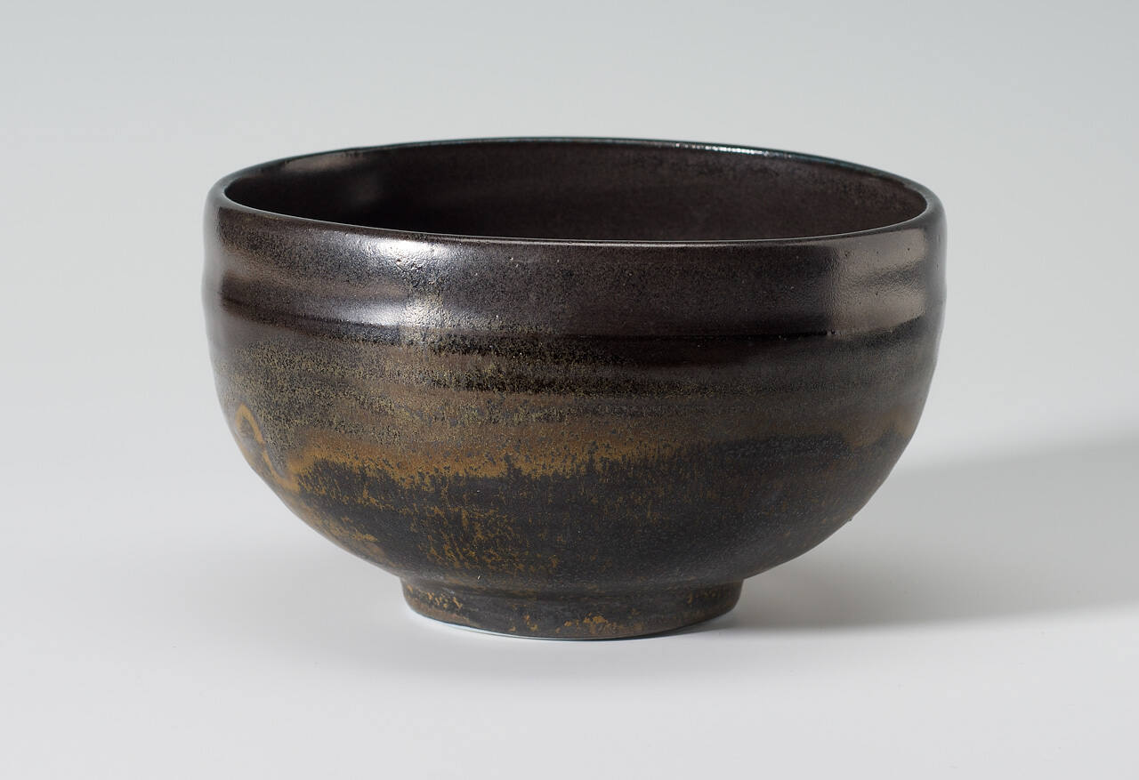 DescriptionThrown tea or small bowl with dark grey to black glaze with splashes of sand-colored glaze on the exterior.Copyright© Toshiko Takaezu Foundation