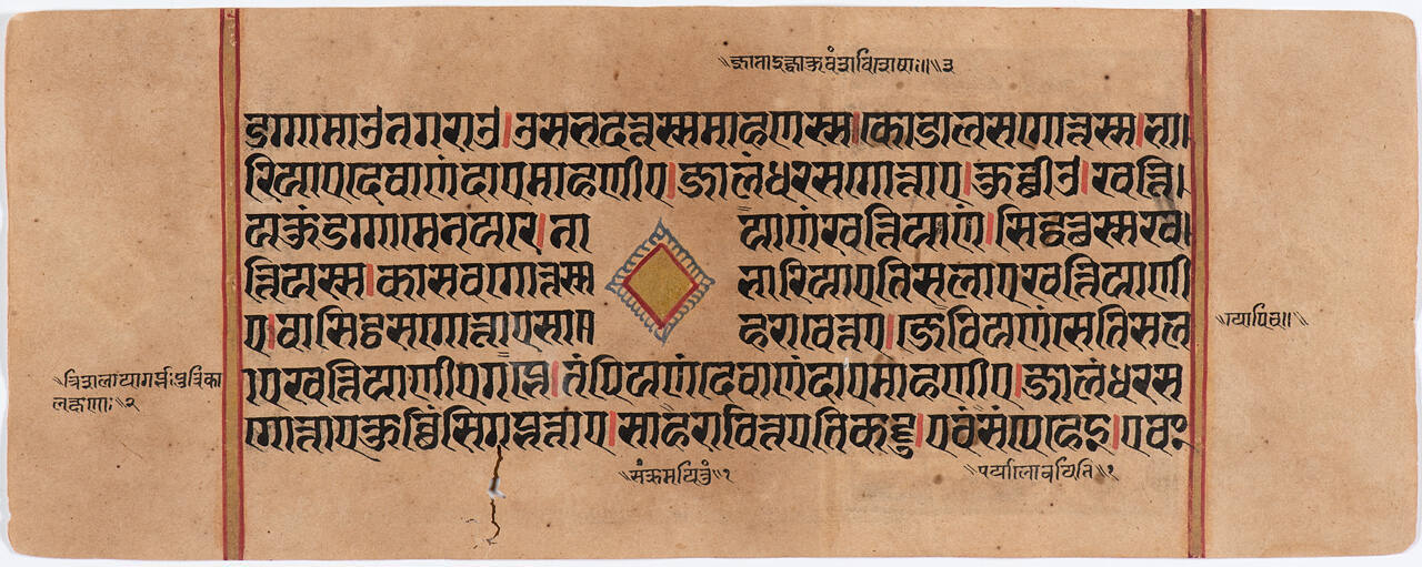 Jain Manuscript of the Kalpasutra and Kalakacavyakatha: recto; text, verso; painting of Shaka (Indra) and Harinegamesi