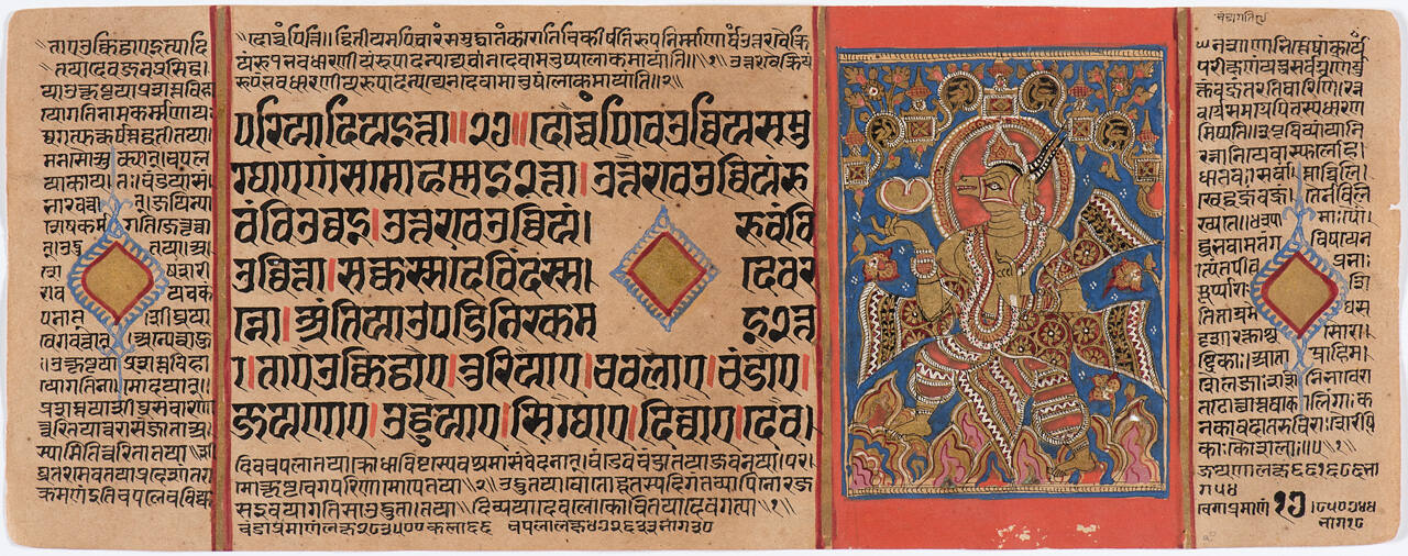 Jain Manuscript of the Kalpasutra and Kalakacarya: recto; text, verso; painting of Harinegamesi striding over Mountains carrying the Embryo 1501