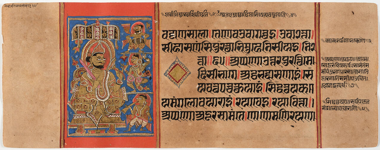 Jain Manuscript of the Kalpasutra and Kalakacavyakatha: recto; painting of Siddhartha with Dancer and Musicians summoning an Astrologer, verso; text