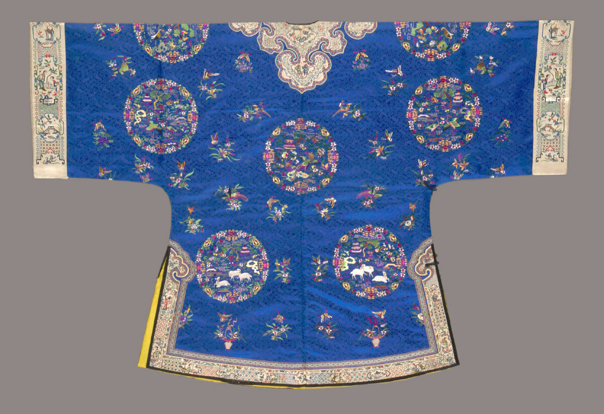 DescriptionBlue silk damask, pattern of bats and clouds. Polychrome embroidered medallions of animals in landscape settings and small bird and flower sprays. Bands of white satin embroidered with figures and floral patterns around neck, sleeves and bottom of skirt.