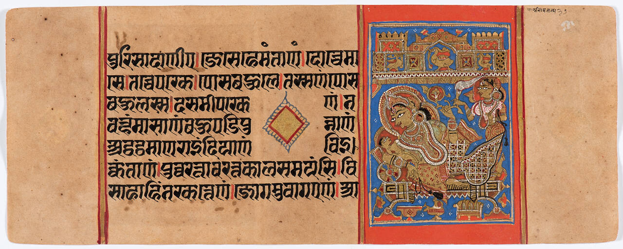 Jain Manuscript of the Kalpasutra and Kalakacavyakatha: recto; painting of Parshva's Birth, verso; painting of Shakra (Indra) lustrates Parshva on Mt. Meru