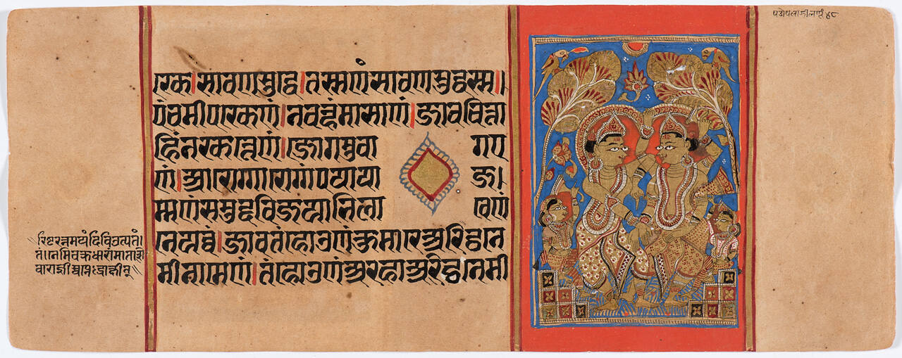 Jain Manuscript of the Kalpasutra and Kalakacavyakatha: recto; painting of Krishna and his Wives talk Nemi into Marrying, verso; painting of Nemi rides in his Wedding Chariot past Animals for Slaughter