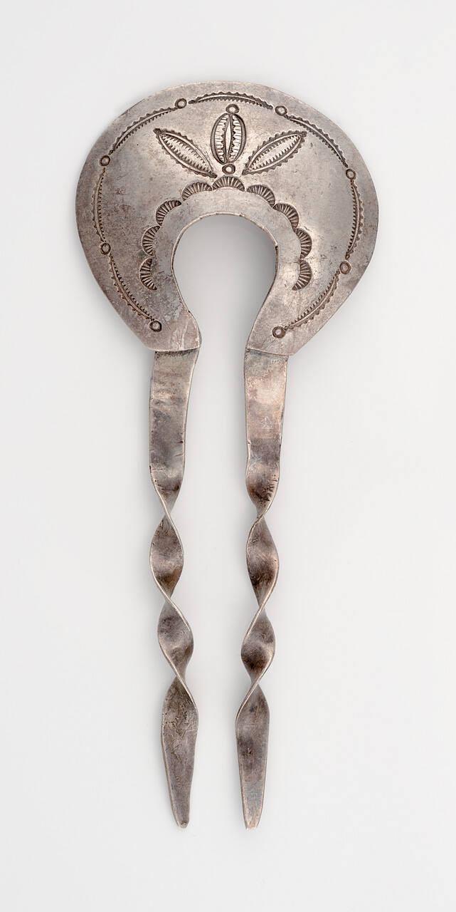 DescriptionSilver hair pin with 3 stamped incised leaves and other geometric elements terminating into 2 loosely twisted prongs. One of a pair.