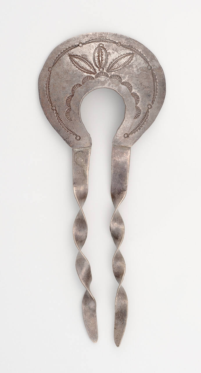 DescriptionSilver hair pin with 3 stamped incised leaves and other geometric elements terminating into 2 loosely twisted prongs. One of a pair.