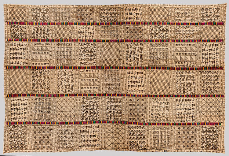 DescriptionThe cloth is a large white fabric with black patterns printed on it. It is composed by joining together several long, one-foot-wide strips edge-to-edge employing a distinctive embroidery technique that uses colored threads. Against the dominant white background are several stamped motifs arranged in squares, also created with the stamps. The end-design is grid-like. During pre-colonial times, Adinkra cloths, as such cloths were called, were mainly associated with funerals. The term adinkra, “to give message”, meant that the Asante intended the cloth’s stamped motifs as message bearers; indeed each different motif had a specific meaning, so a finished cloth could be inscribed with multiple messages--personal, political, and philosophical. The expectation was that the deceased would carry the messages to relatives who have long departed. The pink background of this cloth identifies it as “Sunday Adinkra”, the type that one wears to church and similar joyous ceremonies.ProvenanceWith John Akwasi Adu Agyei, Kenteland Enterprise, Accra, Ghana, by 2012 [1];