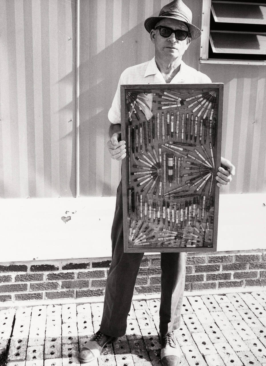 DescriptionImage of a man wearing a hat and sunglasses holding a shadow box displaying a collection of pencils.Copyright© Larry Schwarm Photography