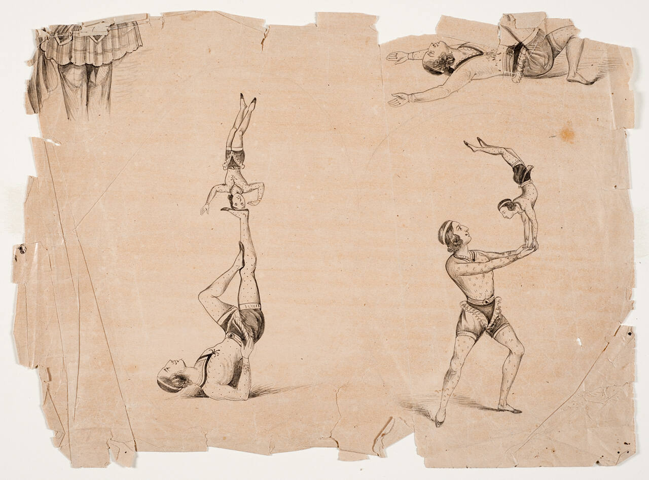 DescriptionOne of four fragments of a large drawing of tumblers and acrobats. Torn at vertical and horizontal central folds. Edges torn and folded. Portrait of a man (European) and child at center of page. Man's face is torn away, as are parts of his and the child's body. Remainder of page filled with European acrobats and tumblers doing various stunts.