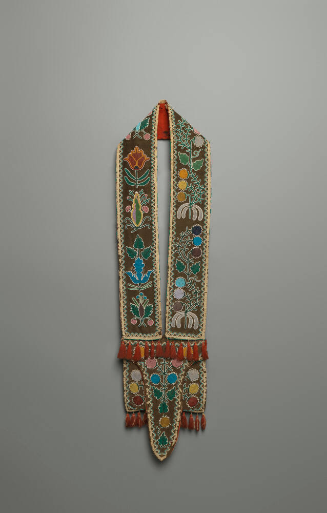 DescriptionBandolier with bead embroidery on wool cloth foundation, designs consist of various scrolling geometric shapes and forms.ProvenanceJoanne and Lee Lyon, Aspen, CO;