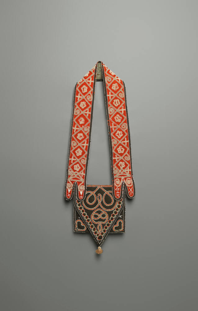 DescriptionBandolier with bead embroidery on wool cloth foundation, designs consist of various scrolling geometric shapes and forms.ProvenanceWilliam Spruce Macay, Salisbury, North Carolina;