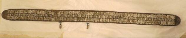 DescriptionNative leather belt comprised of three rows of caribou teeth across the length of the belt terminating with brass end-plates. Shell casings and glass beads act as suspensions from the bottom edge.