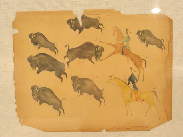 DescriptionGraphite and watercolor drawing on paper depicting a buffalo hunt of seven buffalo and two horse-mounted hunters.