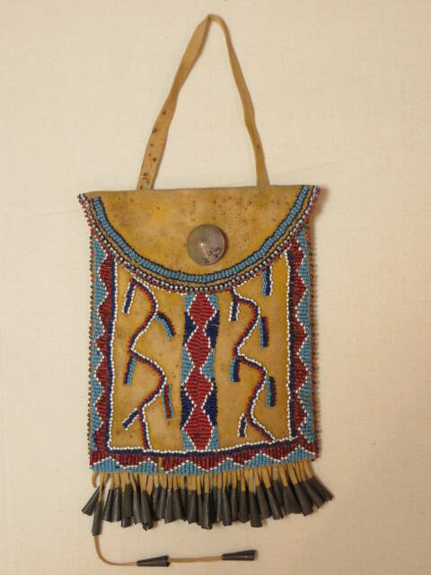 DescriptionBeaded leather bag with fold over flap and a short strap with fringe of metal cones across the bottom.