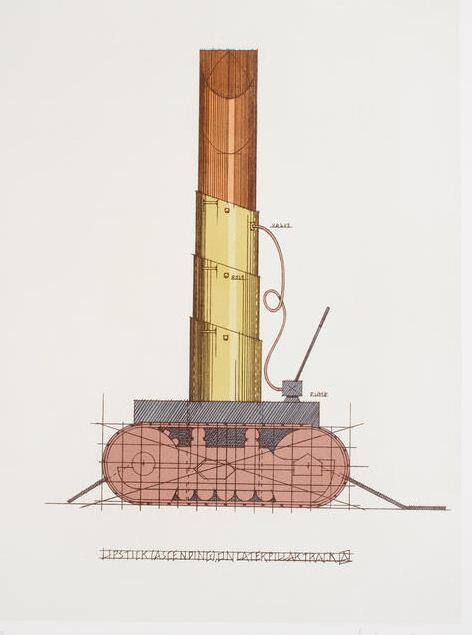 DescriptionThis vertical-format, color lithograph consists of a soft cream-colored, rectangular background printed on white paper. Upon this is printed a precise, mechanical, scale profile drawing of a tube of lipstick set upon a platform resting upon caterpillar tracks. A pump lever and air hose are attached to this structure at viewer right. The caterpillar section is overlaid with a scale grid. Beneath the structure is the title of the work of art, printed in block capital letters. The caterpillar section is tan, the platform and pump are gray, the lipstick tube is a soft golden color, and the lipstick protruding from the tube is orange.Copyright© Estate of Claes Oldenburg