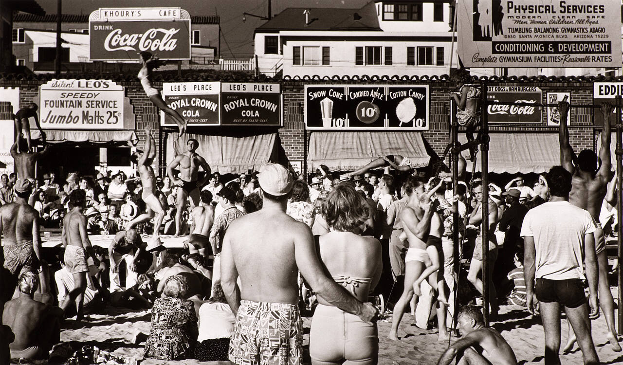 DescriptionImage of a crowded beach with people watching acrobats; in the background are storefront signs advertising popular refreshments.Copyright© Center for Creative Photography, The University of Arizona Foundation