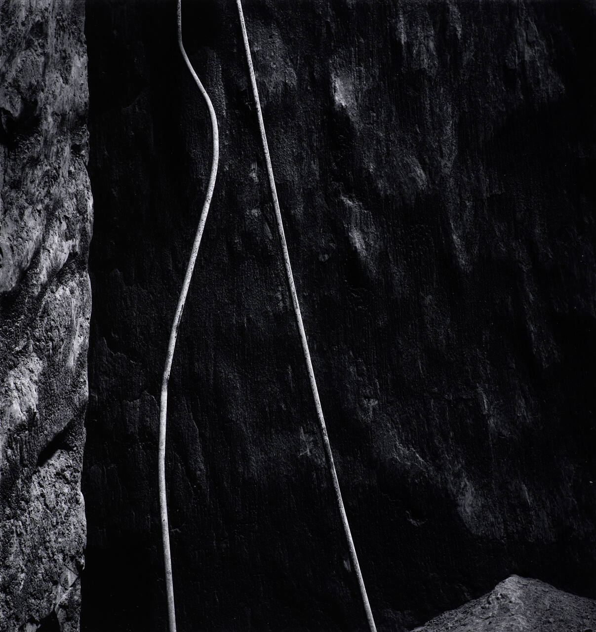DescriptionDetailed image of rocky/stone surface with two string-like forms draped vertically along the left.Copyright© Carl Chiarenza