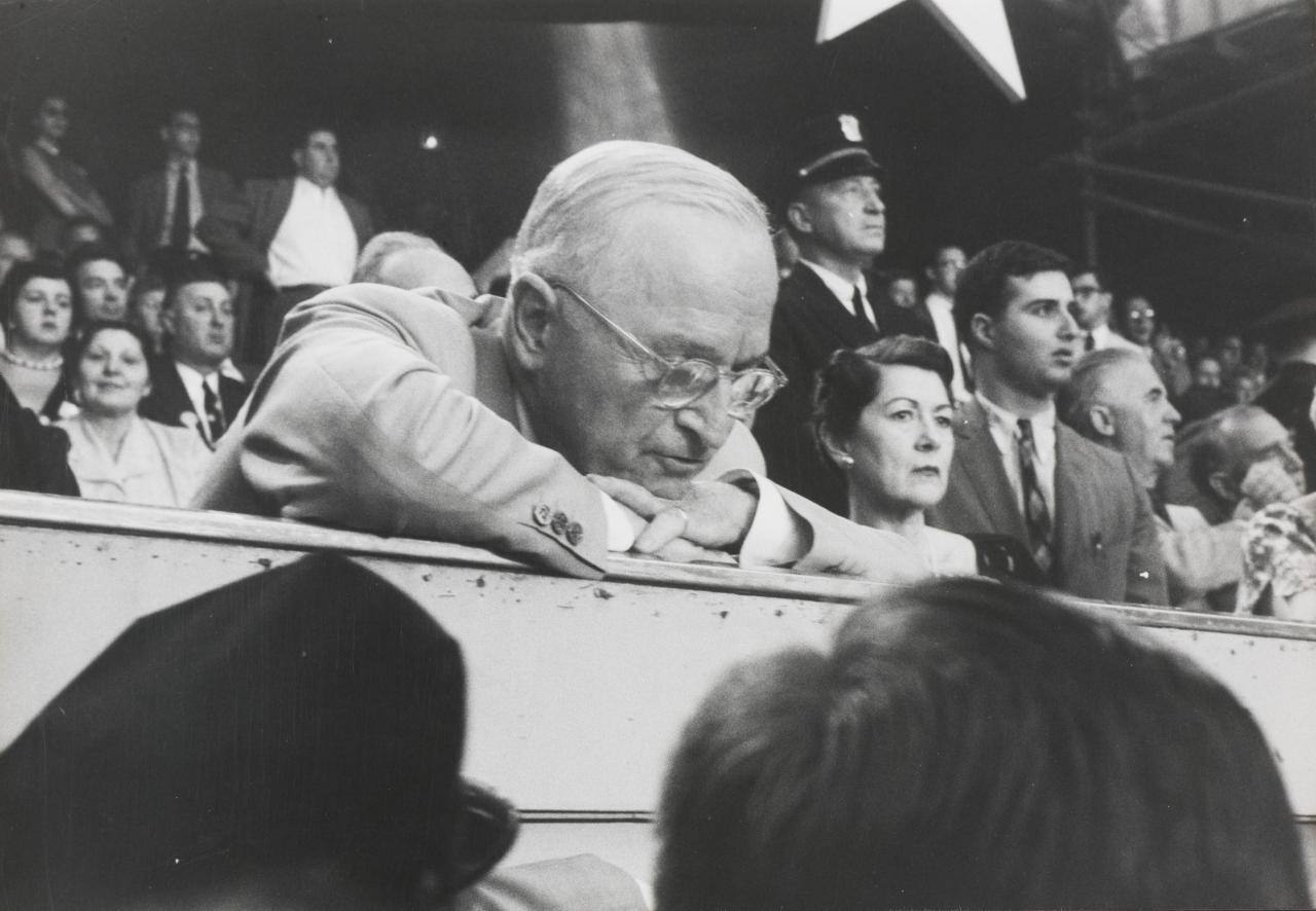 DescriptionImage of President Truman leaning on a ledge with large crowd behind him.Copyright© Estate of Lee Balterman