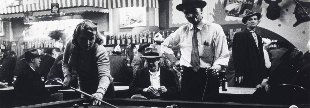 DescriptionImage of a woman shooting pool and a man standing nearby; row of bottles visible behind bar.Copyright© Estate of Lee Balterman