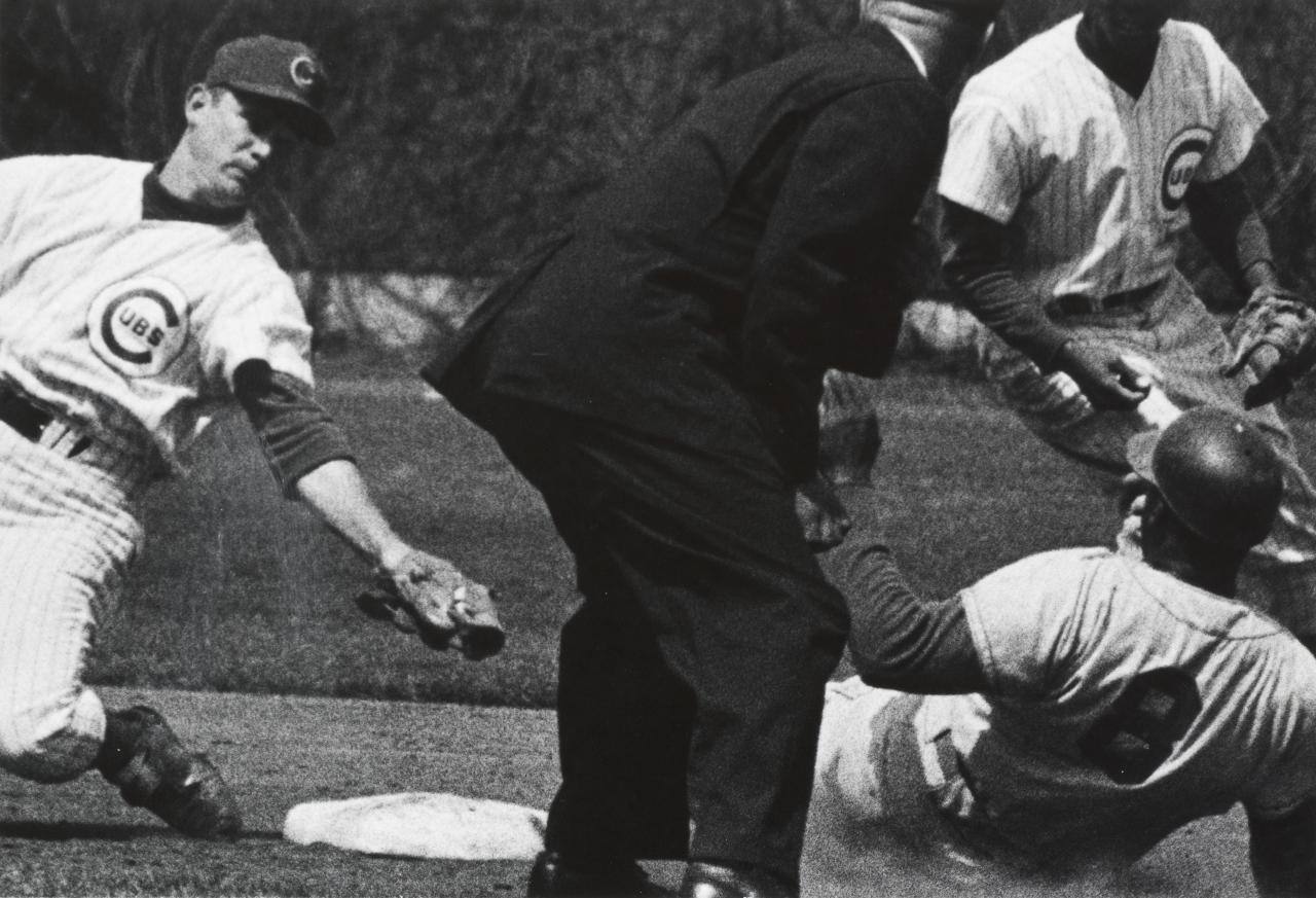 DescriptionImage of baseball player sliding into base; two Cubs players nearby.Copyright© Estate of Lee Balterman